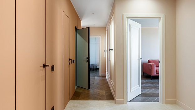 «Если потолки позволяют, я всегда рекомендую рассматривать двери до потолка. Это решение моментально меняет восприятие пространства и выглядит гораздо современнее стандартных форматов», — подчёркивает Анна Астафьева.