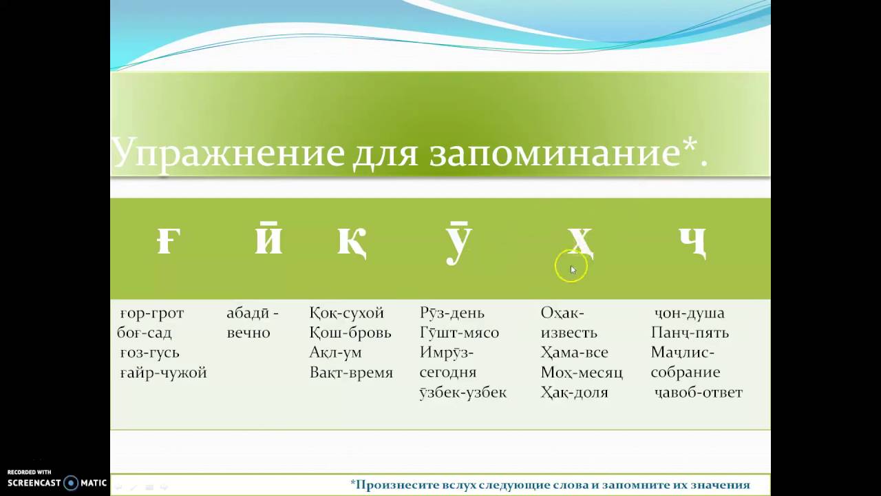 Таджикский алфавит и произношение букв ғ, ӣ, қ, ӯ, изображения
